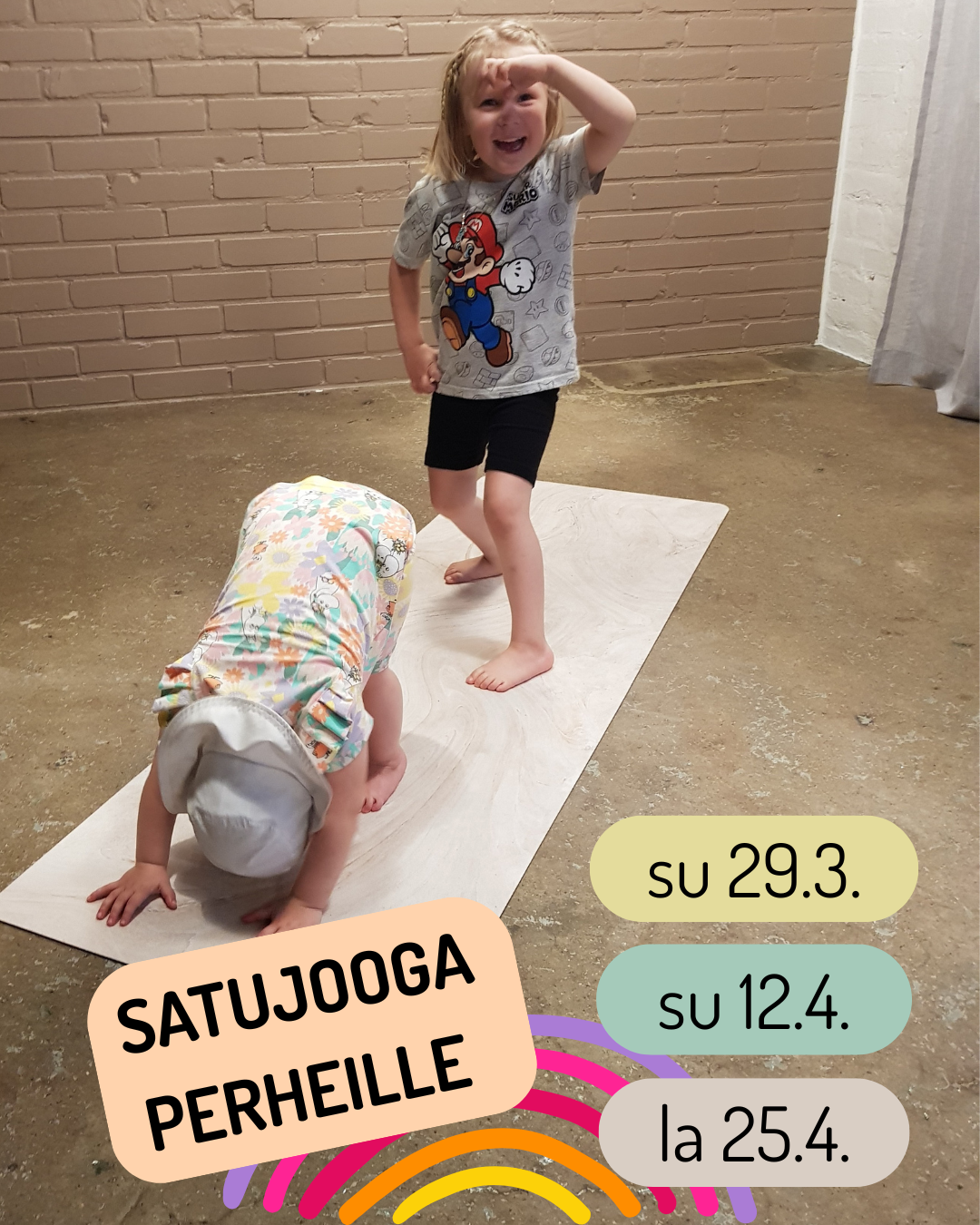Satujooga on rento ja hauska tunti koko perheelle. Tunnilla lapsi touhuaa yhdessä oman vanhemman, isovanhemman tai muun tärkeän aikuisen kanssa.